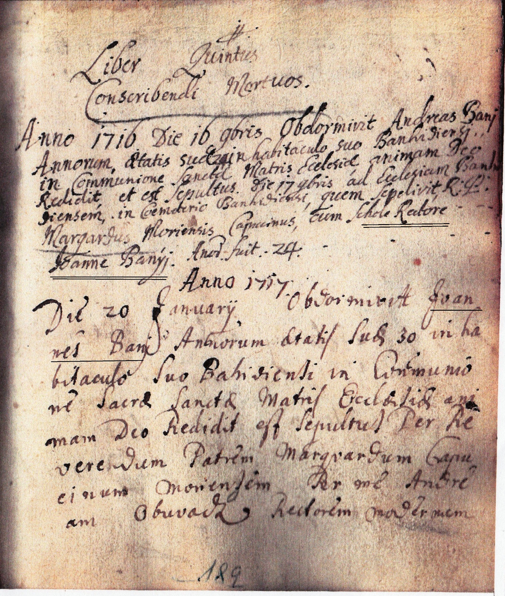 Banyi János (Johanes Bany) halálának bejegyzése a bánhidai anyakönyvbe. (1717 jan. 20 )